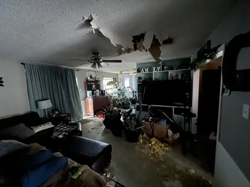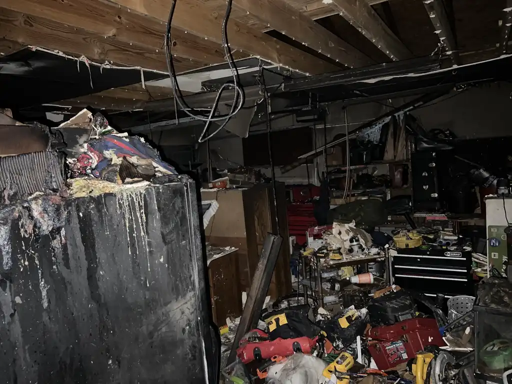As shown in the original damage photos, the fire left sections of the attic completely charred. Ceilings collapsed in multiple rooms, insulation was soaked and scattered across living spaces, and the air was thick with soot. The kitchen and living areas were hit hard—leaving the home unsafe, unlivable, and emotionally overwhelming.